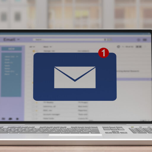 Laptop screen displaying an email inbox with a large email icon and a red notification badge indicating one new message.