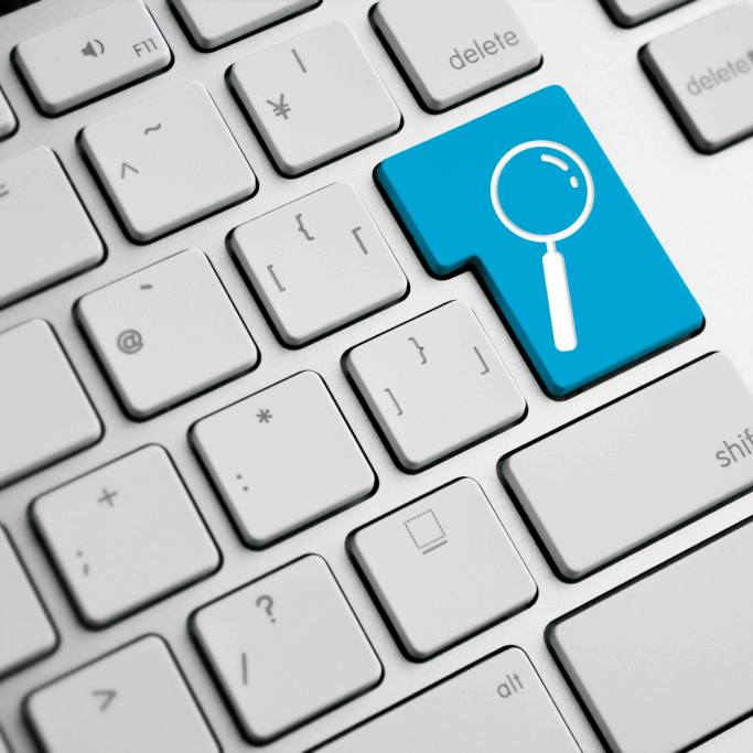 Close-up of a white computer keyboard with a unique blue key featuring a magnifying glass icon, symbolizing a search function.